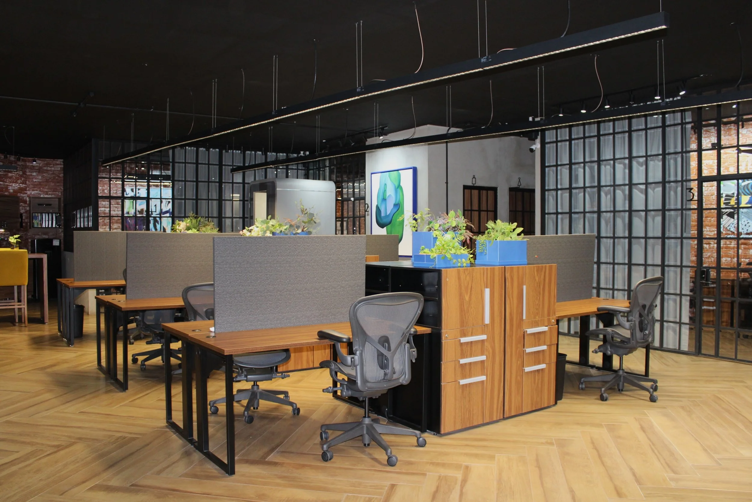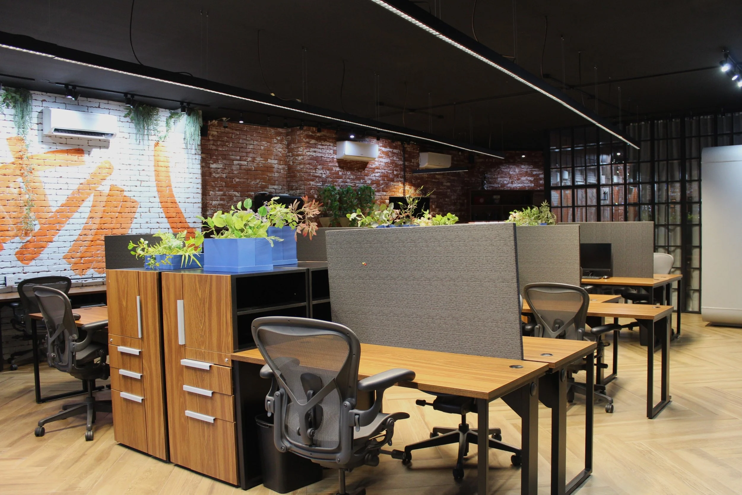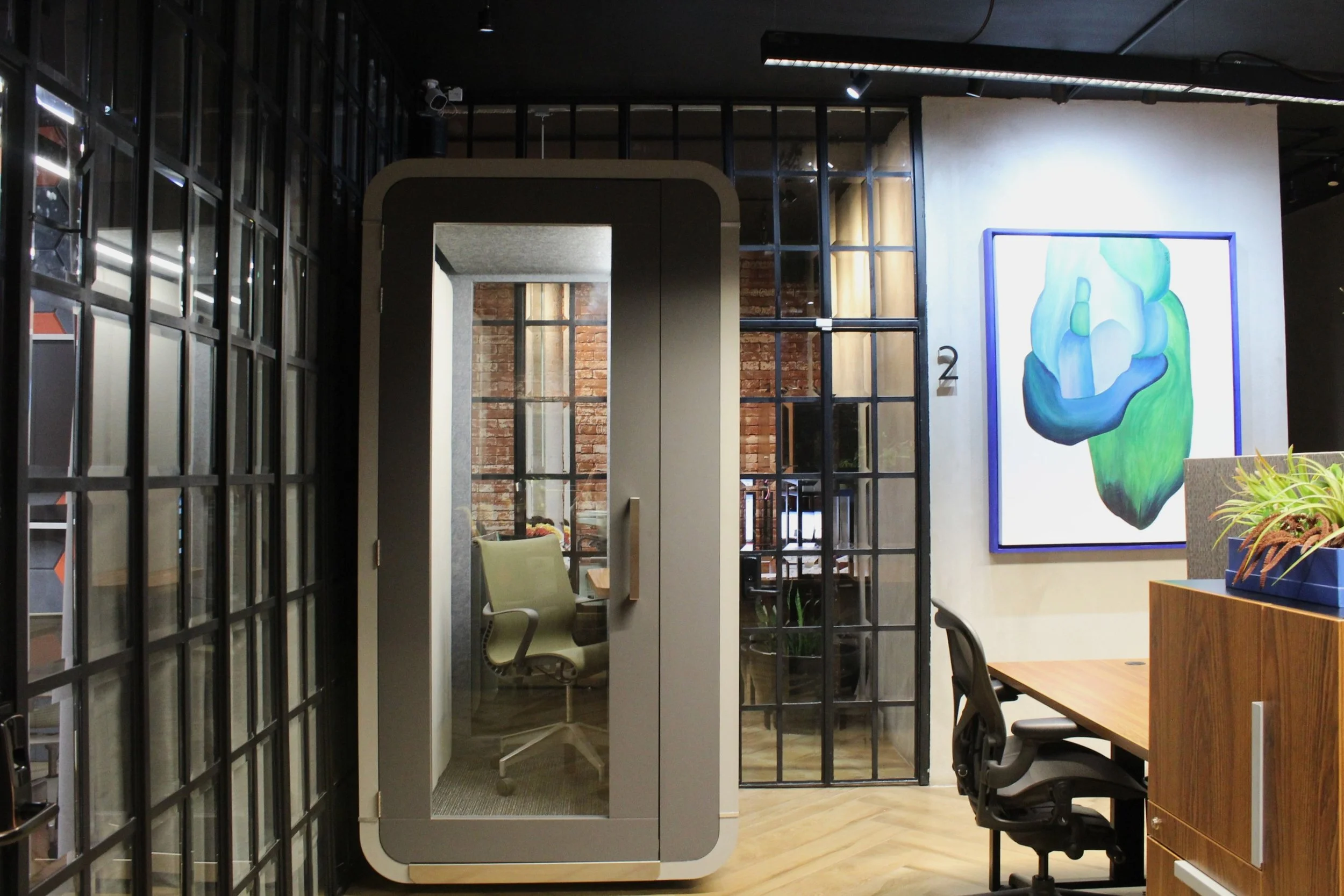 Escritorio asignado en espacio abierto, cuenta con archivero con llave y cabina telefonica para llamadas y trabajo en privacidad.